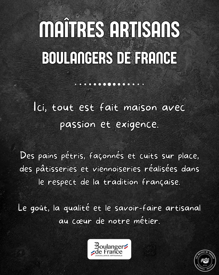 Notre boulangerie porte fièrement le titre de Maîtres Artisans – Boulangers de France, un gage de savoir-faire, de qualité et de tradition.